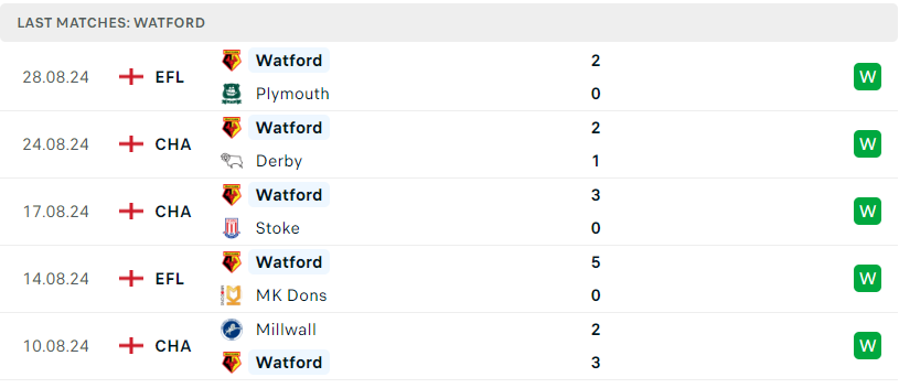 Bên phía kia, Watford lại đang trình diễn một bộ mặt vô cùng chói sáng ở mùa giải năm nay. Sau tổng cộng 5 trận đấu đã chơi tính cả EFL và Carabao Cup, đoàn quân Tom Cleverley đã thắng cả 5 trận. Trong số này, The Hornets thậm chí còn đánh bại những đối thủ khá tên tuổi như Millwall, Stoke và cả tân binh Derby County. Không chỉ có vậy, Watford còn cho thấy sự chắc chắn trong khâu phòng ngự khi đã giữ sạch lưới trong 3/4 trận đấu.