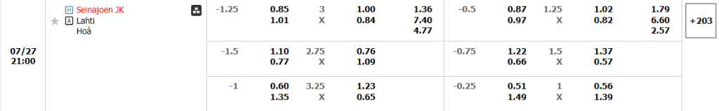 Không quá bất ngờ khi SJK thêm một lần nữa nhận được sự ưu ái ở kèo Châu Âu, khi mức ăn của họ là 1.36 và con số này của Lahti là 7.40. Trên thực tế, trong cuộc đấu giữa đội bóng đá đua vô địch và là ứng viên tiềm năng cho ngôi vua và “kẻ lót đường” và thậm chí là cái tên số 1 cho tấm vé xuống hạng thì thật khó để có bất ngờ và 3 điểm sẽ nằm gọn trong túi của SJK.