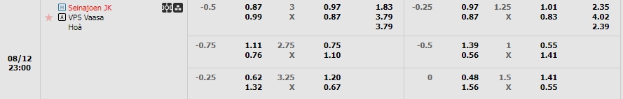 Kèo Châu Âu tiếp tục là sự ưu ái dành cho đội chủ nhà, khi mức ăn của họ chỉ là 1.83 và con số này của các vị khách là 3.79. Chừng đó là đủ để thấy chênh lệch của hai đội thời điểm hiện tại, SJK với ưu thế về mọi mặt và đang sở hữu phong độ tốt sẻ giúp họ nắm quyền chủ động hơn nữa lịch sử đối đầu cũng đang ủng hộ các cầu thủ chủ nhà với sự vượt trội, lựa chọn SJK cho kèo Châu Âu.