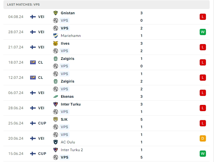 Trong khi đó với VPS, họ vừa nhận thất bại trước Gnistan, đây là trận thua thứ 7 của họ sau 10 trận đã qua, trải qua 18 lượt trận VPS mang về 8 chiến thắng, 4 hòa và 6 thất bại, có được 28 điểm và đang xếp vị trí thứ 6 trên BXH, hàng công của VPS mang về 29 bàn thắng và hàng thủ nhận 28 bàn thua, 5 trận gần nhất phải thi đấu xa nhà, hàng công của VPS mang về 4 bàn thắng và hàng thủ nhận 15 bàn thua, 4/5 trận đấu đó đều khép lại 90 phút từ 3 bàn thắng trở lên.