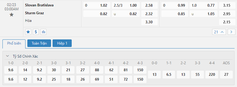 Bảng tỷ lệ kèo bóng đá trận đấu Slovan Bratislava vs Sturm Graz
