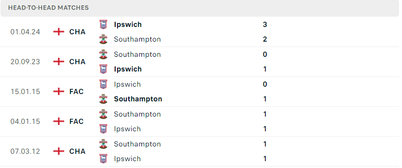 Thành tích đối đầu của Southampton vs Ipswich