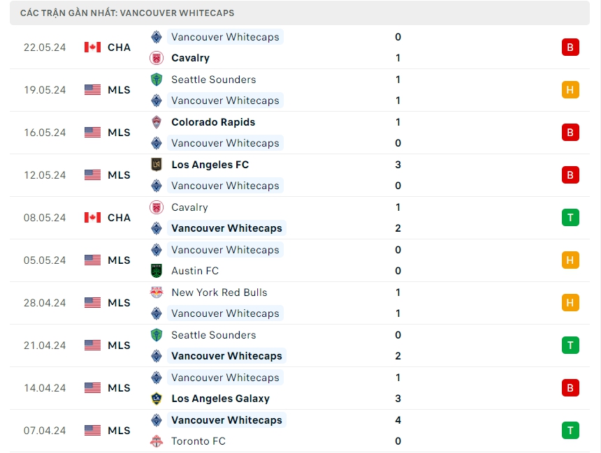 -Phong độ Vancouver Whitecaps