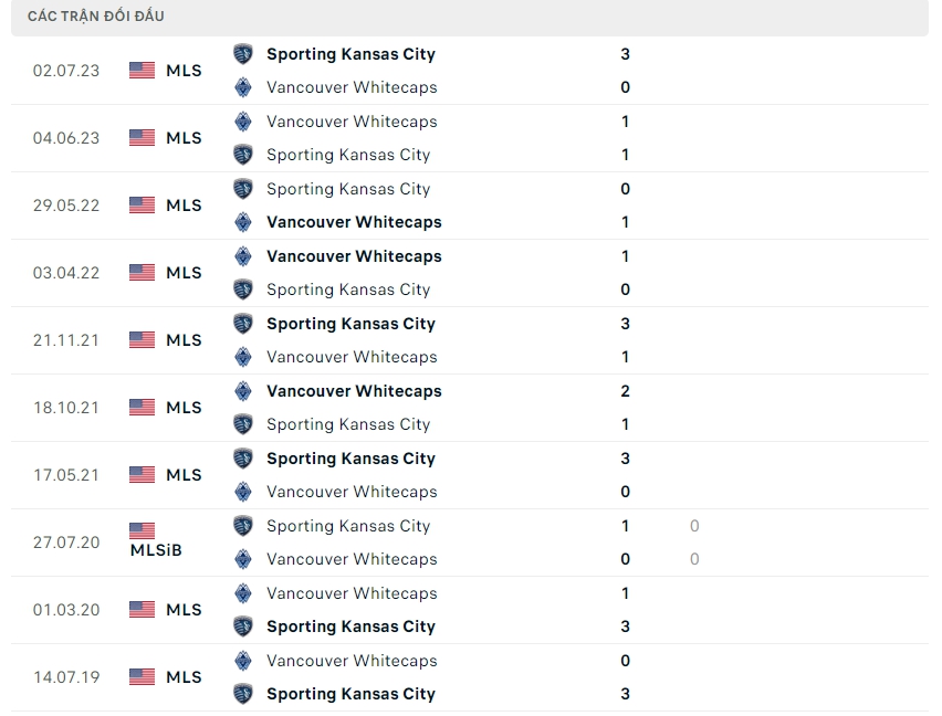 Lịch sử thi đấu của Sporting Kansas City vs Vancouver Whitecaps