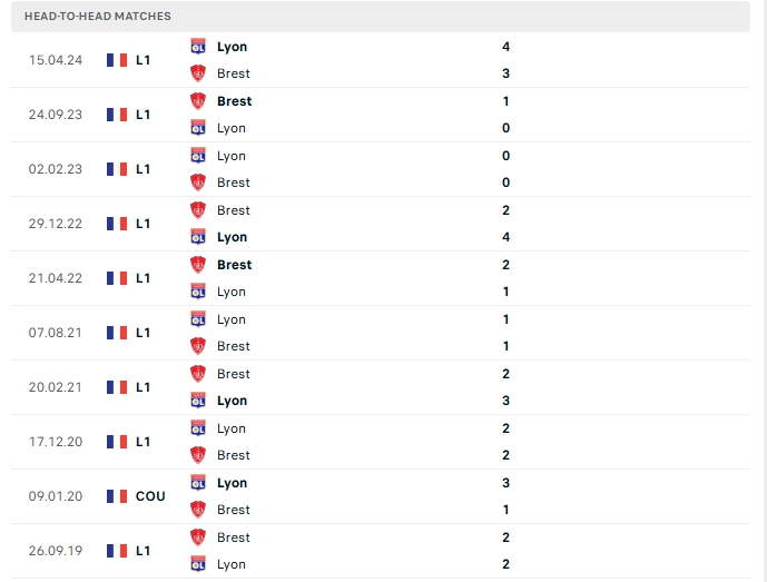 Lịch sử thi đấu giữa Stade Brestois và Lyon cũng chứng kiến những màn đối đầu hấp dẫn với nhiều bàn thắng được tạo ra, trong đó 3/5 lần chạm mặt gần nhất của hai đội và 4/5 trận đón tiếp Lyon trên sân nhà Stade Francis-Le Blé của Stade Brestois đều khép lại vượt mốc 3 bàn, một trận đấu hay và đáng chờ đợi.
