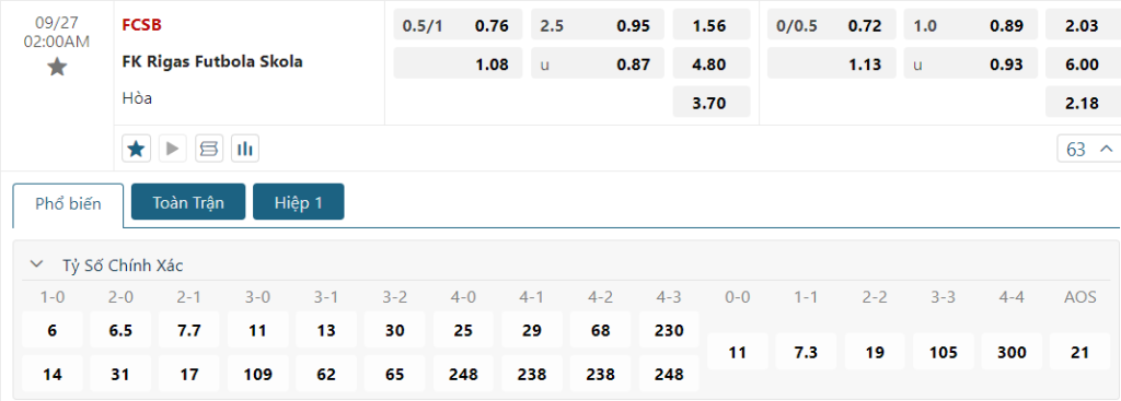 Bảng tỷ lệ kèo bóng đá trận đấu Steaua Bucuresti vs Rigas Futbola Skola