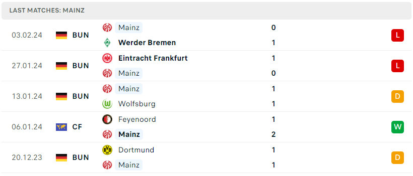 Trong khi đó với Mainz, tập thể này vẫn đang trải qua một mùa giải đặc biệt khó khăn khi cũng chỉ mang về duy nhất 1 chiến thắng sau 20 vòng đấu. Chưa nói, với vỏn vẹn 11 điểm hiện có thì đoàn quân Jan Siewert đang được xem là ứng viên cho tấm vé xuống hạng, khi bởi lẽ cách biệt về điểm số giữa họ và nhóm an toàn đã lên đến 6 điểm. Một khoảng cách không dễ sang lấp khi mùa giải cũng đã trôi qua hơn một nửa chặng đường. Chuyến làm khách trước Stuttgart được dự báo là một nhiệm vụ không hề dễ dàng.