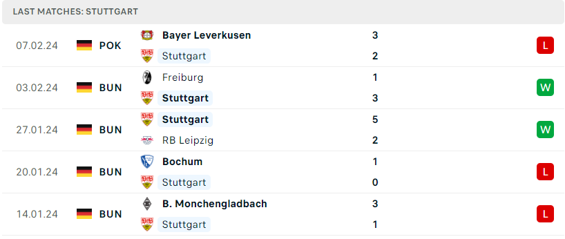 Dù đã dừng bước ngay tại tứ kết cup quốc gia sau khi để thua 2-3 trước Leverkusen ít giờ trước nhưng trên thực tế màn trình diễn của Stuttgart vẫn duy trì được một sự ổn định tuyệt đối. Hiện thầy trò Hoeness đang tạm thời được xếp ở vị trí thứ 3 trên BXH với 40 điểm sau 20 vòng đấu. Một mùa giải cực kỳ thành công đối với Stuttgart cho đến lúc này và nếu cứ tiếp tục thi đấu trong trạng thái như hiện tại thì rõ ràng họ hoàn toàn có đủ cơ sở để suy nghĩ về một tấm vé đến với Champions League năm sau.