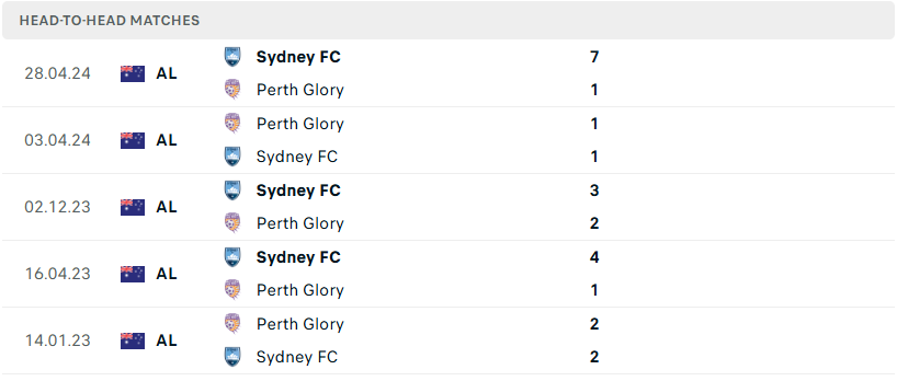 Không chỉ vượt trội về phong độ và thực lực, Sydney FC còn đặc biệt áp đảo ở thành tích đối đầu khi giành tới 4 chiến thắng và 2 trận hòa trong 6 lần chạm trán gần nhất với Perth Glory. Vị khách với bộ mặt bạc nhược cùng lối chơi bất ổn và thiếu sát thương, dường như không có cơ sở nào để tạo nên bất ngờ, Sydney FC lại đang trên đà khởi sắc, thật khó để Perth Glory mơ về điều thần kỳ.