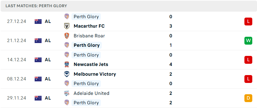 Ở chiều ngược lại, Perth Glory tiếp tục thể hiện một bộ mặt bạc nhược ở mùa giải năm nay, nối dài những thất vọng từ mùa giải trước, nơi họ cán đích ở vị trí cuối BXH. Sau 10 vòng đấu, đội bóng này chỉ giành được duy nhất 1 chiến thắng. Hàng công của Perth Glory gần như mất hút với chỉ 5 bàn thắng ghi được, trong khi hàng thủ để thủng lưới tới mức báo động, khiến hiệu số bàn thắng bại chạm mức -22. Chuyến làm khách đến Sydney chắc chắn là một thử thách vô cùng khó khăn.