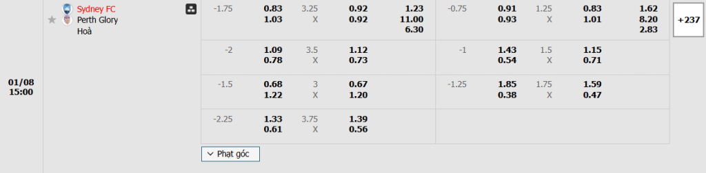 Kèo Châu Âu hiện đang ưu ái vượt trội cho Sydney FC, với mức ăn chỉ là 1.23, trong khi con số của các vị khách Perth Glory lên tới 11.00. Điều này đã phần nào phản ánh sự chênh lệch rõ rệt giữa hai đội bóng ở thời điểm hiện tại. Sydney FC đang sở hữu phong độ khởi sắc, kinh nghiệm dày dạn và sức mạnh vượt trội. Với toàn bộ những cơ sở đó, 3 điểm chắc chắn sẽ thuộc về đội chủ nhà.