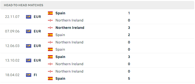 Thành tích đối đầu của Tây Ban Nha vs Bắc Ireland
