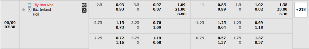Bảng tỷ lệ kèo bóng đá trận đấu Tây Ban Nha vs Bắc Ireland