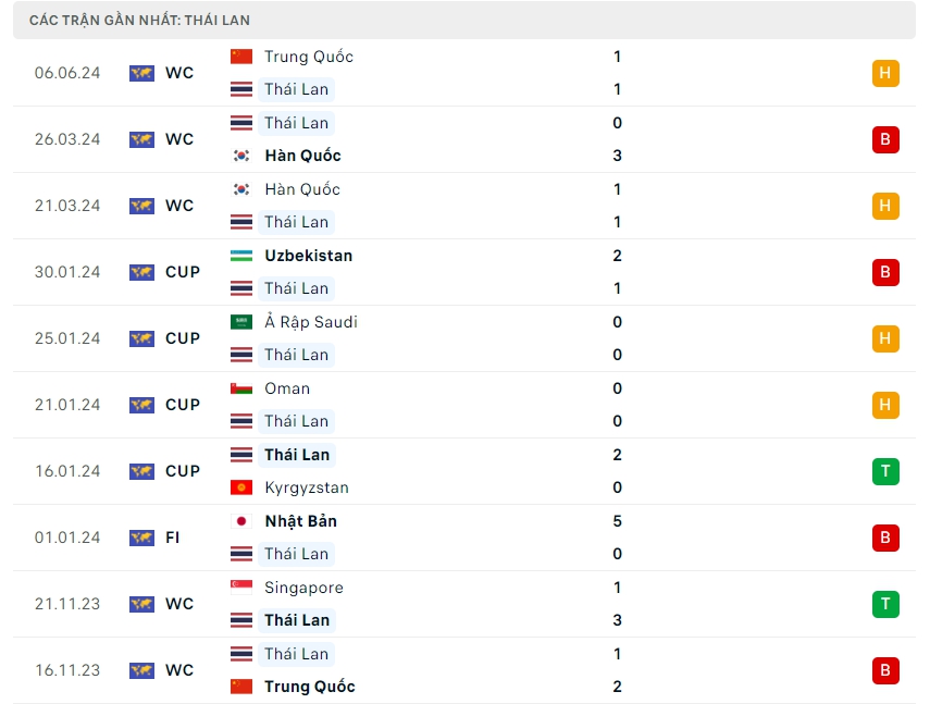 Phong độ đội bóng Thái Lan vs Singapore
