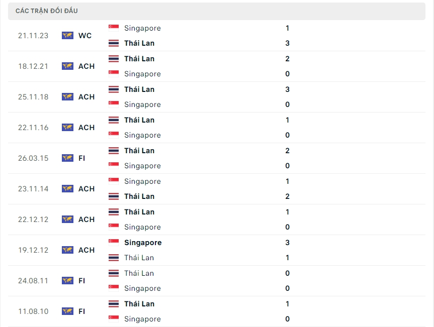 Lịch sử thi đấu của Thái Lan vs Singapore