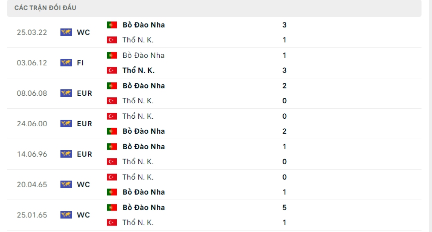 Lịch sử thi đấu của Thỗ Nhĩ Kỳ vs Bồ Đào Nha
