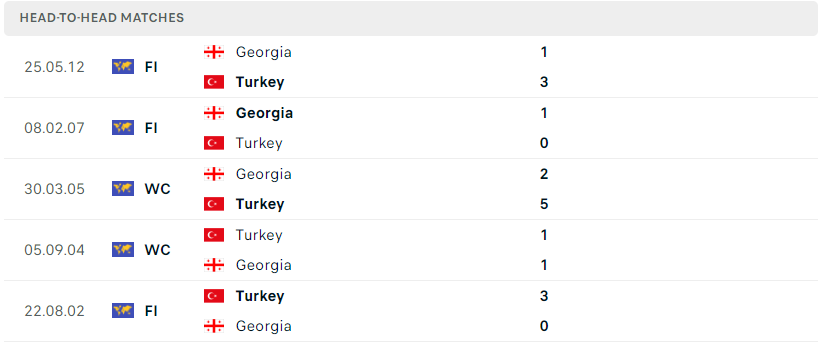 Thành tích đối đầu của Thổ Nhĩ Kỳ vs Georgia
