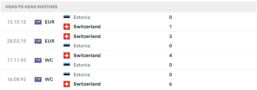 Thành tích đối đầu của Thụy Sĩ vs Estonia