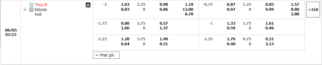 Kèo Châu Âu vẫn đang là sự áp đảo dành cho ĐT Thụy Sĩ, khi mức ăn của họ là 1.19 và con số này của Estonia lên đến 12.00. Trên thực tế, với sự khác biệt về mặt chuyên môn ở hiện tại cùng với bản lĩnh và sự kinh nghiệm của Thụy Sĩ, cửa thắng của Estonia trước Thụy Sĩ rõ ràng là gần như bằng không, nếu như không muốn nói là không thể.