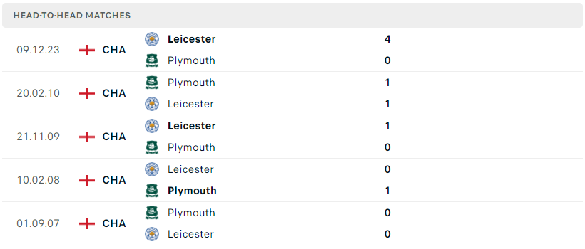 Thành tích đối đầu của Plymouth vs Leicester City