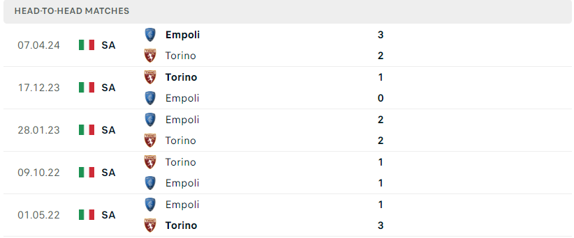 Lịch sử thi đấu tiếp tục ghi nhận sự cân bằng khi cả hai đội cùng có 1 chiến thắng và 2 trận hòa trong 4 lần gặp gỡ gần nhất. Điều này cho thấy sự cân kèo giữa Torino và Empoli, và khả năng trận đấu tới sẽ kết thúc với một kết quả hòa là rất cao. Một thế trận chặt chẽ sẽ được thiết lập và kết quả hòa 1-1 sẽ làm hài lòng đôi bên.