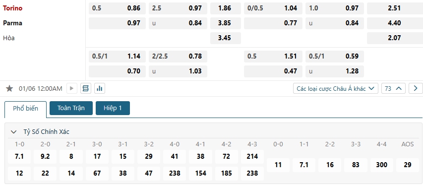 Lợi thế mang tên sân nhà vẫn đang giúp cho Torino nhận được sự ưu ái trong kèo đấu này, qua mức ăn là 1.86 và con số này của vị khách Parma là 3.85. Tuy nhiên, không vì vậy mà vội đánh giá thấp Parma với những gì họ đang thể hiện trên sân khách và những lần hành quân đến sân của đối thủ, một kết quả hòa là hợp lý cho màn đụng độ này.
