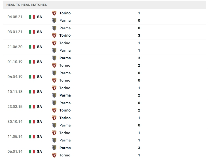 Lịch sử thi đấu của Torino vs Parma