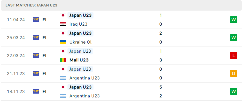 Phong độ đội bóng U23 Nhật Bản vs U23 Trung Quốc