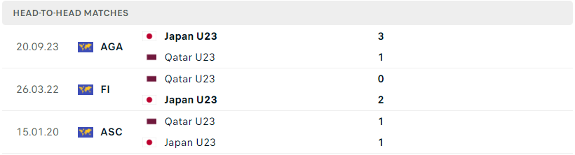 Thành tích đối đầu của U23 Qatar vs U23 Nhật Bản