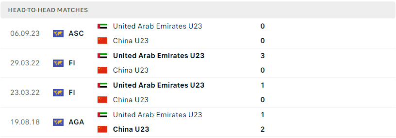 Thành tích đối đầu của U23 United Arab Emirates vs U23 Trung Quốc