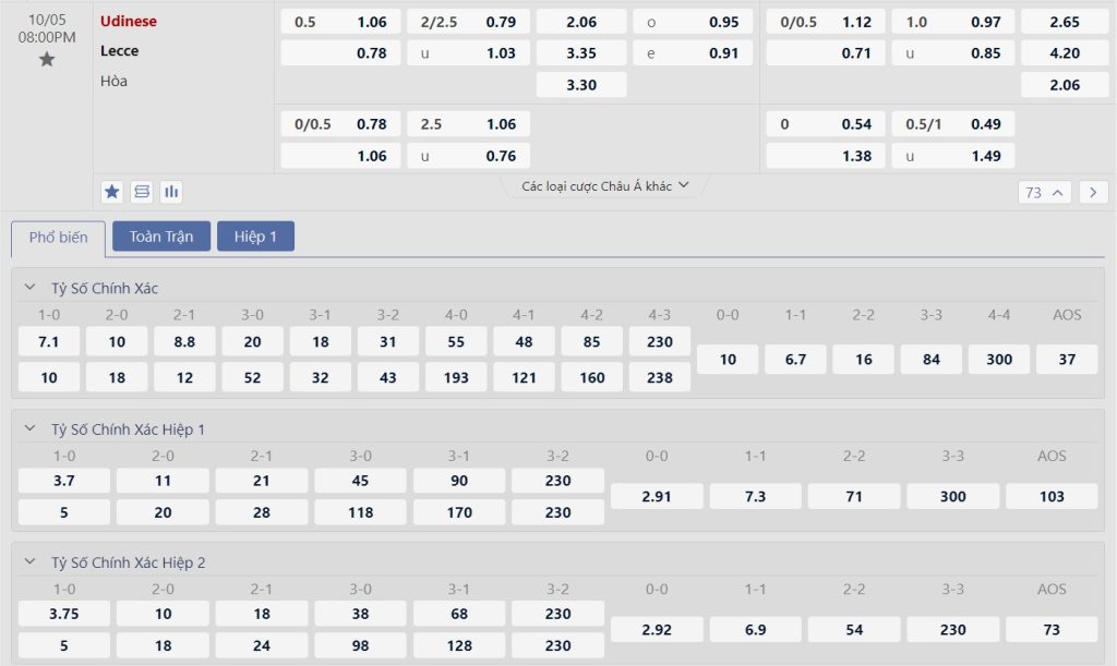 Kèo Châu Âu vẫn đang là sự vượt trội dành cho đoàn quân của HLV Kosta Runjaic khi tỷ lệ cho chiến thắng của họ là 2.06 trong khi con số bên phía các vị khách là 3.35. Bấy nhiêu là đủ cho thấy sự khác biệt, ưu thế sân nhà, chất lượng đội hình cùng với lịch sử đối đầu vượt trội là cơ sở để Udinese có cho mình chiến thắng dễ dàng.
