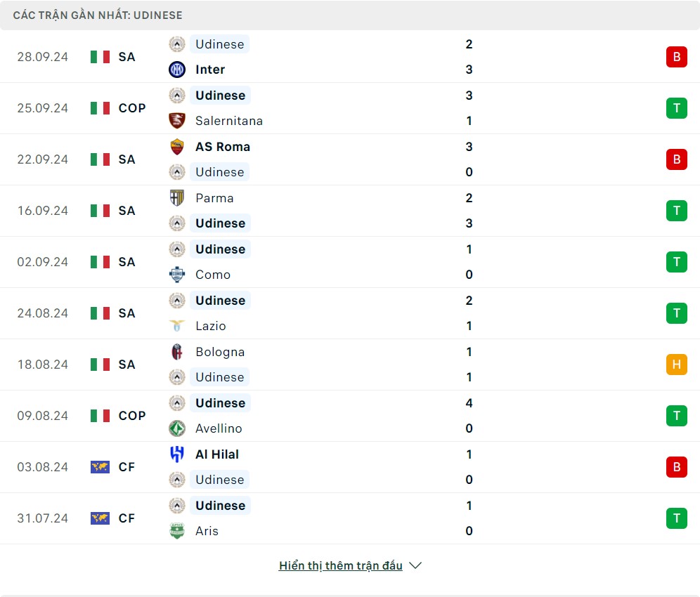 Phong độ đội bóng Udinese vs Lecce