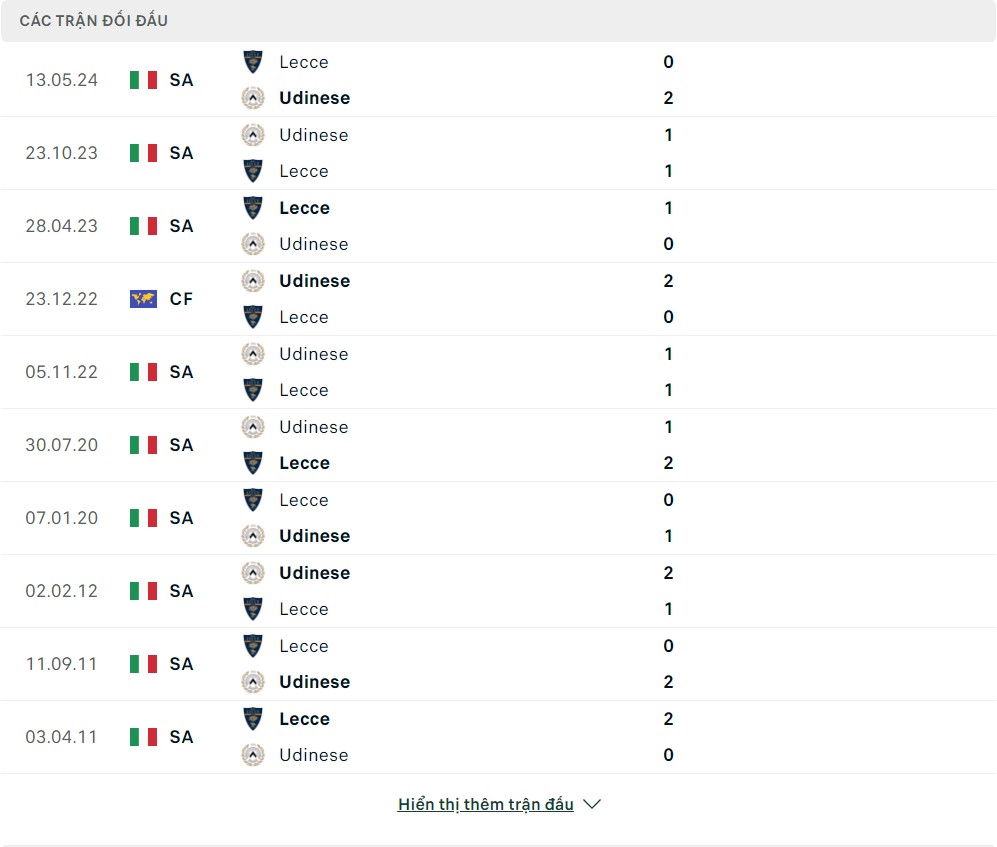 Lịch sử thi đấu của Udinese vs Lecce
