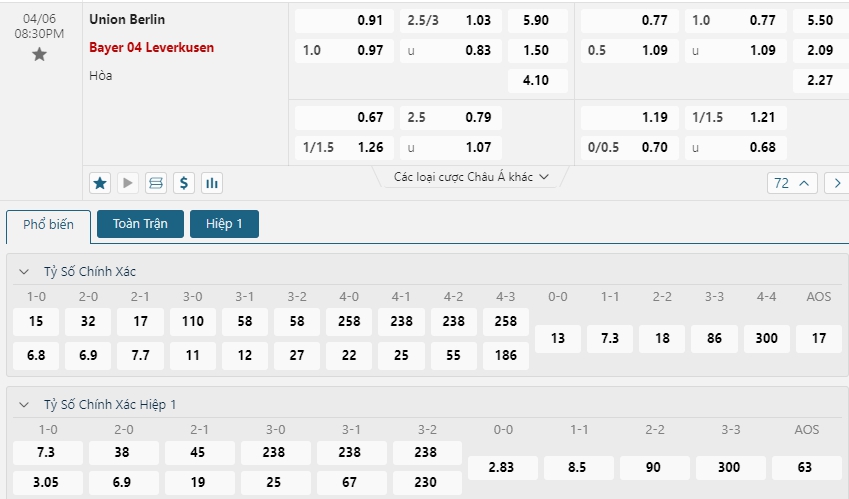 Bảng tỷ lệ kèo bóng đá trận đấu Union Berlin vs Bayer Leverkusen