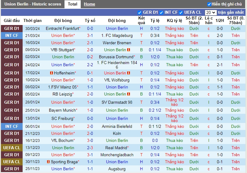 Trong khi đó với Union Berlin, đội bóng thủ đô vẫn đang ít nhiều đang cho thấy sự trở lại sau những chuỗi trận không tốt trước đó, họ có được 1 chiến thắng và 1 hòa ở 2 trận gần nhất. 29 điểm có được sau 27 vòng đấu , Union Berlin vẫn đang tạo ra khoảng cách đến 9 điểm so với nhóm cầm đèn đỏ. Một cách biệt vẫn là khá an toàn, và họ đang hướng đến những vị trí cao hơn, dù vậy hàng công của Union Berlin ở mùa giải năm nay chơi không quá ấn tượng khi chỉ mang về 25 bàn thắng, trong khi hàng thủ để thủng lưới 42 bàn thua.