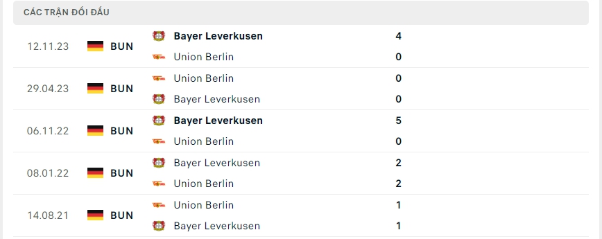 Lịch sử thi đấu của Union Berlin vs Bayer Leverkusen