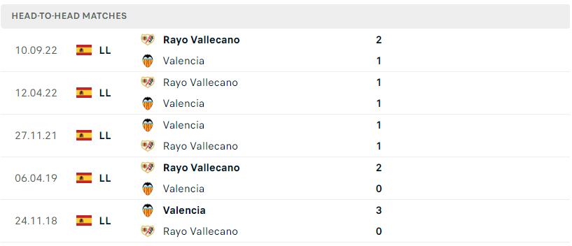 Thành tích đối đầu của Valencia vs Rayo Vallecano