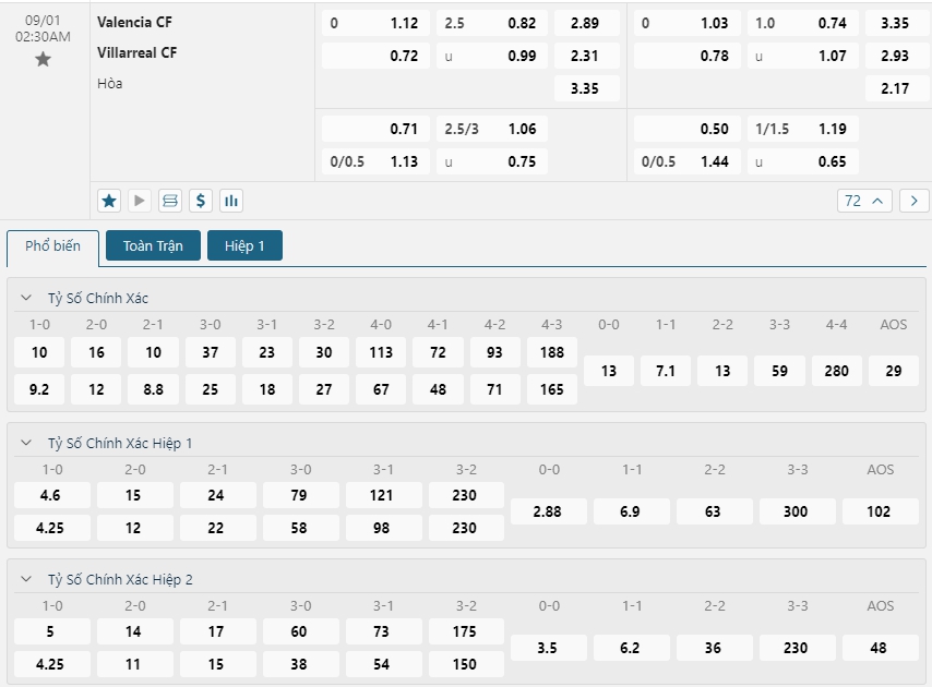 Kèo châu Âu cũng là ưu thế nhỏ cho các vị kháchkhi mức ăn của họ là 2.31 và đối thủ của họ Valencia là 2.89, Valencia dù có ưu thế sân nhà và lịch sử đối đầu đang ủng hộ nhưng với phong độ không tốt cùng lối chơi thiếu gắn kết sẻ khiến họ gặp nhiều khó khăn, thậm chí là nhận thất bại trong trận đấu sắp tới.