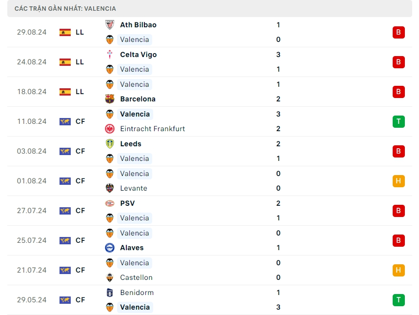 Valencia vừa qua nhận thất bại 0-1 trước Ath Bilbao, đây là thất bại thứ 3 liên tiếp của họ sau 3 vòng đấu đầu tiên, chưa có được điểm số nào thì hiện tại Valencia đang xếp cuối cùng trên BXH, hàng công của Valencia mang về 2 bàn thắng và hàng thủ đang chơi tệ khi nhận 6 bàn thua, 2/3 trận đấu đó khép lại 90 phút từ 3 bàn thắng trở lên, trên sân nhà của mình Valencia cũng đang chơi tệ với chỉ 1 chiến thắng, 2 hòa cùng 2 thất bại sau 5 trận, với hàng công có được 4 bàn thắng và hàng thủ nhận 5 bàn thua, 2/3 trận gần nhất của Valencia trên sân nhà khép lại từ 3 bàn trở lên.