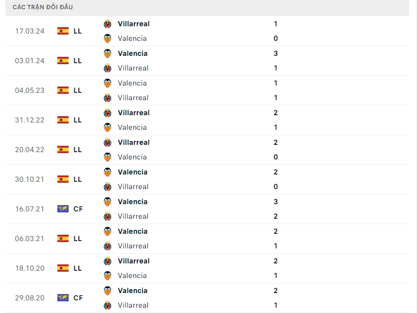 Ở lần đụng độ gần nhất của hai đội thì chiến thắng thuộc về các cầu thủ Villarreal khi họ đánh bại Valencia với tỷ số 1-0 trên sân nhà, trận đấu tới đây sẻ hứa hẹn hấp dẫn khi hàng công của hai đang chơi tốt cùng với hàng thủ chơi thiếu chắc chắn với phong độ tốt của mình Villarreal nhiều khả năng là đội bóng có được chiến thắng sau cùng.