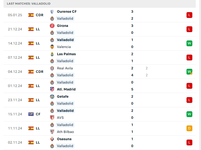 Valladolid vừa gây thất vọng khi bị đội bóng yếu Ourense CF đánh bại ở đấu trường Cup, còn ở sân chơi quốc nội họ nhận thất bại trước Valladolid ở trận đấu gần nhất, trải qua 18 trận đấu Valladolid chỉ có được 3 chiến thắng, 3 hòa cùng 12 thất bại có được 12 điểm và đang xếp cuối cùng trên BXH, Hàng công của Valladolid mang về 12 bàn thắng cùng hàng thủ nhận 37 bàn thua sau 18 trận đấu, 2/3 trận vừa qua của Valladolid khép lại không quá 2 bàn, trên sân nhà của mình hàng công của Valladolid có được 6 bàn thắng cùng hàng thủ nhận 12 bàn thua sau 9 trận đấu, 2/3 trận vừa qua của Valladolid khép lại không quá 2 bàn.