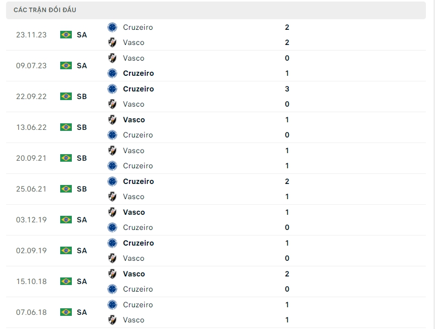 Lịch sử thi đấu của Vasco vs Cruzeiro