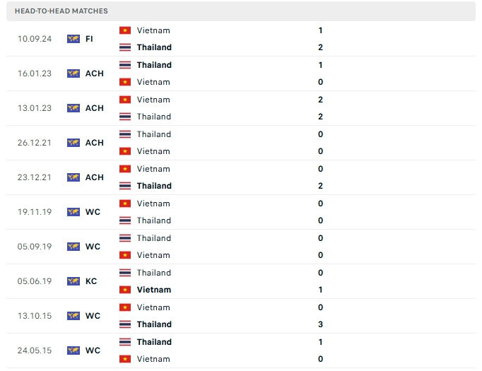 Lịch sử thi đấu của Việt Nam vs Thái Lan
