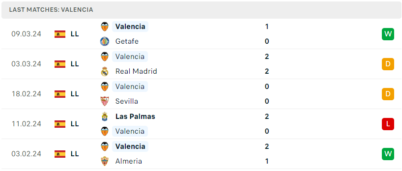 Trong khi đó với Valencia, tập thể này cũng đang trình diễn một phong độ cực kỳ khởi sắc trong giai đoạn nước rút, sau khi xuất sắc ngắt mạch của Real Madrid thì bầy Dơi tiếp tục đánh bại Getafe để leo lên vị trí thứ 8 trên BXH. Dù đã nhiều khó khăn ở đầu mùa nhưng càng thi đấu Valencia càng thể hiện thực lực và sự vào form của họ dưới thời Ruben Baraja. Một phong độ bay cao và chắc chắn các vị khách sẽ đặt mục tiêu cao nhất trong chuyến đi sắp tới.