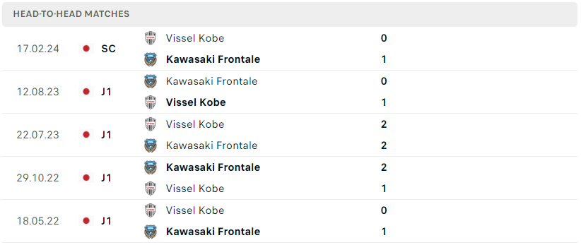 Thành tích đối đầu của Vissel Kobe vs Kawasaki Frotale