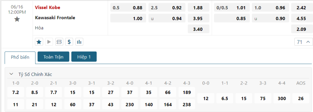 Bảng tỷ lệ kèo bóng đá trận đấu Vissel Kobe vs Kawasaki Frotale