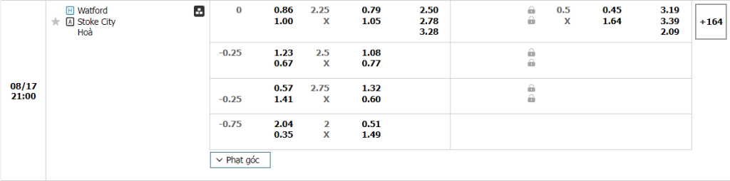Với lợi thế mang tên sân nhà thì Watford hiện cũng phải chịu bất kỳ sự thua thiệt nào so với Stoke City, tỷ lệ kèo vẫn đang ở mức đồng banh. Trên thực tế, với những gì mà “The Hornets” đã thể hiện dưới trướng Tom Cleverley thì tin chắc rằng trước một đối thủ khó chịu như Stoke họ chơi hết sức. Chưa kể, binh đoàn vàng còn được chơi trên sân nhà và thành tích của họ tại đây cũng là tương đối tốt với việc không thua Stoke ở cả 2 trận đấu gần nhất. Dẫu phong độ của Stoke là cực tốt và chuỗi trận thăng hoa vẫn chưa có dấu hiệu dừng lại khi họ tiếp tục đánh bại Coventry. Tuy nhiên, trước sự lớn mạnh không ngừng của Watford cùng quyết tâm và hơn hết là lợi thế sân nhà, vẫn có đủ những cơ sở để đặt niềm tin vào “The Hornets” ở kèo Châu Á.