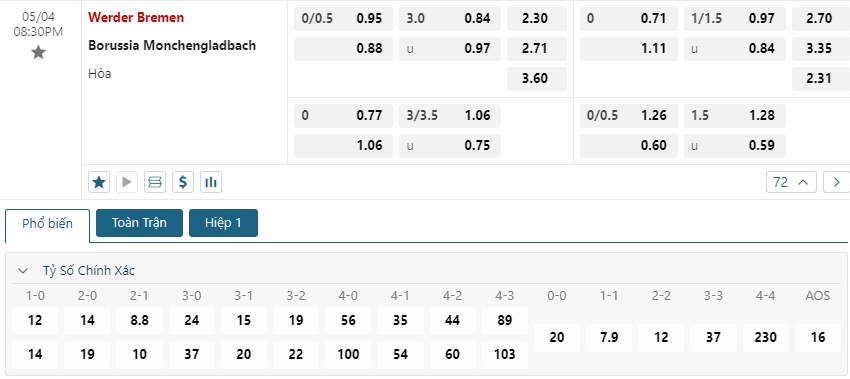 Bảng tỷ lệ kèo bóng đá trận đấu Werder Bremen vs B. Monchengladbach