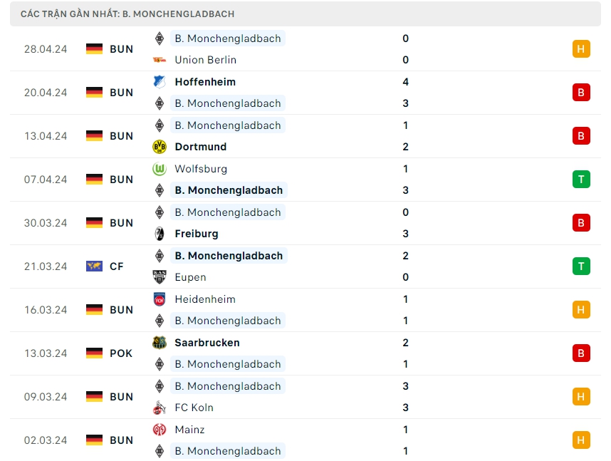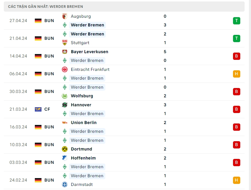 Phong độ đội bóng Werder Bremen vs B. Monchengladbach