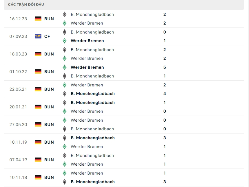 Lịch sử thi đấu của Werder Bremen vs B. Monchengladbach